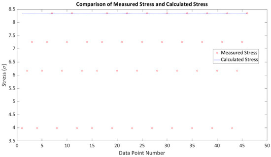 Considering an example and examining actual figures, an initial 20-element array was employed; however, due to the influence of defects, only 12 elements were found to be usable, rendering twelve data points available for each stress increment. Additionally, the FMC approach provided 12 × 12 or 144 data points, while utilising the robotic system to test each point three times resulted in a dataset of 432 data points (see Figure 13 and Figure 14b). For simplicity, we assume the usage of twelve data points for each stress increment, and Figure 13 illustrates four stress increments. The graph depicted in Figure 13 was generated using MATLAB code to solve Equation (8), which is based on the measurement data including ToF measured using the PAUT system (Figure 4) and average stress calculated using FEA analysis with the load cell as input. Polynomial curve fitting was performed using the MATLAB polyfit function, and the optimised parameters were derived from the coefficients. Once the acoustoelastic coefficients were estimated, Equation (8) was adjusted to account for the stress becoming unknown but calculable if the PAUT system measures the ToF (indicated by the blue line in Figure 13). In the single-element approach, the Newton–Raphson method was employed for each individual dataset, yielding a range of stress values based on the considered dataset. The summarized results are presented in Figure 14 and Table 3.
