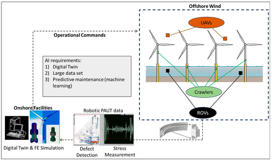 An exemplary scenario for future application of this system in offshore wind farms is shown in Figure 15. If the PAUT end-effectors are connected to robotic facilities, UAVs, crawlers, and ROVs, a comprehensive internal and external inspection of bolts and welds can be conducted. This will provide information on potential defects and, more importantly, early signs of defect generation through monitoring stress. These data can be transferred to onshore facilities where FE simulation and digital twinning can help analyse the load and then send operational commands, such as adjusting the angle of wind turbine blades, to prevent further damage and reduce stress concentration points.