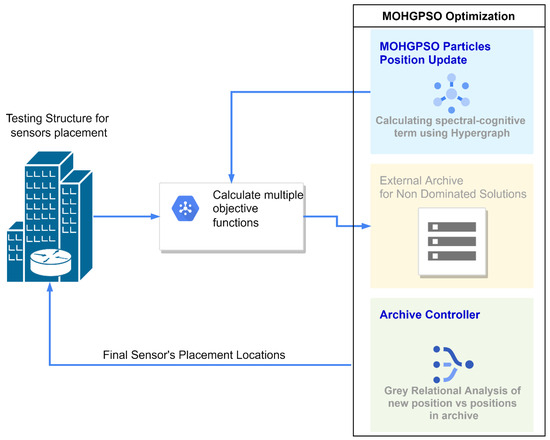 This section provides a detailed explanation of the proposed MOHGPSO algorithm and its application in determining the most relevant sensor placements. It discusses the incorporation of multiple structural objectives and the generation of a Pareto front with non-dominated solutions. The section also mentions the use of a novel relational analysis to decide new solutions’ entries in the archive.