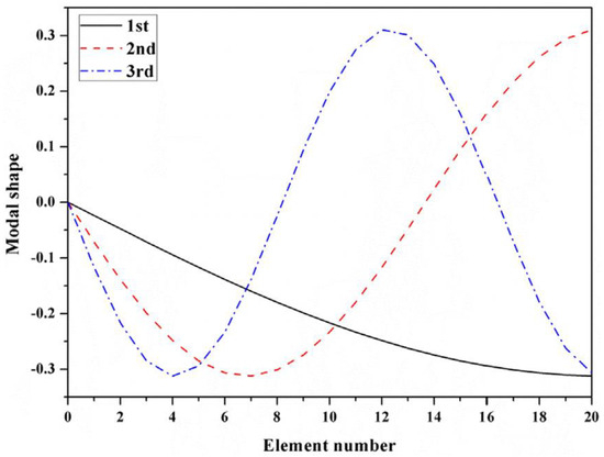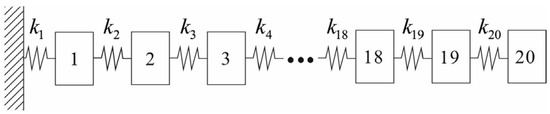 The proposed set-up can be perceived to be analogous to a spring–mass system with, let us say, n = 20 DOFs. As for the case, the parameters are considered to be and . Keeping one-side fixed to realise the marginal constraints, each node with a DOF can be considered to hold the sensors. A brief overview can be seen in Figure 5. The first three frequencies and modes can be seen in Table 1 and are also demonstrated in Figure 6. These were deduced considering the MOHGPSO load, and a quinary sensor set was planted in the inceptive manifestation. The attribute setup of the posited MOHGPSO was achieved by deploying GA as follows: the community length was set to approximately while constraining the maximal generation count to . Maintaining a stochastically uniform selection procedure and keeping tolerance near about , the dispersed crossover method was adjusted to The Gaussian mutation assignment was kept around . The delineated setup can be resolved through the forth mentioned entities: the structural DOF count, the sensor population considered, and most crucially, the intricacy of the OSP scenario.