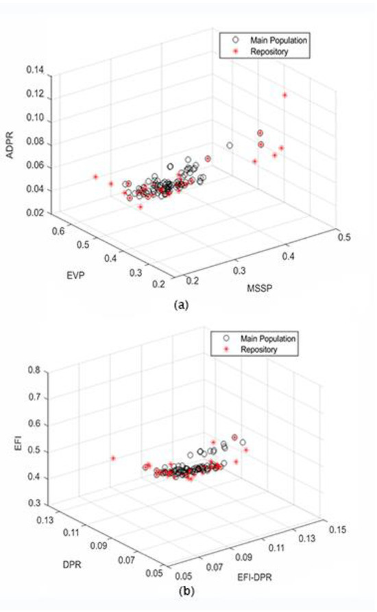 (a) Outcomes obtained through ADPR, EVP, and MSSP coplotted. (b) Outcomes obtained through EFI, DPR, and EFI-DPR coplotted.