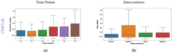 The boxplot in Figure 6a shows the temporal analysis of the dynamic range feature extracted from EMG signals of the left CEM. Notably, the mean values shifted from negative at the initial time points (−0.049 at T1, −0.059 at T2) to positive at later points (0.070 at T4, 0.056 at T5), slightly decreasing to 0.027 at T6. However, the median is consistent around −0.15 for all time points. This suggests potential asymmetry in the distribution of dynamic range values. Interestingly, IQR exhibited a consistent increase from 1.408 at T1 to 2.037 at T6, reflecting a wider range of muscle activity patterns. As shown in Figure 6c, the right CEM Hjorth activity exhibited dynamic temporal fluctuations: the mean oscillated (−0.075 to 0.061), but the median remained stable (−0.34). The IQR values initially ranged from 0.050 to 0.030 and then fluctuated across the time points. This implies dynamic changes in data spread across the time points. These findings highlight Hjorth Activity’s temporal sensitivity and potential for capturing dynamic muscle activity patterns.