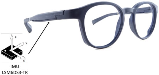 Placement of the Inertial Measurement Unit (IMU) in the temple of the smart eyeglasses.