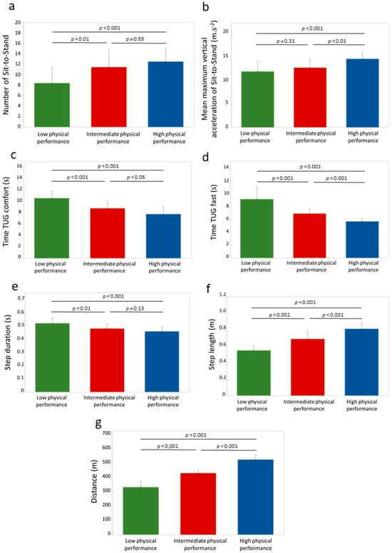 Differences of functional and biomechanical parameters measured between the three performance groups (n = 84). (a) Number of Sit-to-Stand; (b) mean maximum vertical acceleration of Sit-to-Stand; (c) time of TUG comfort; (d) time of TUG fast; (e) step duration; (f) step length and; (g) distance. Times of fast TUG were analyzed through Kruskall–Wallis test and ANOVAs were used for all other parameters. Significant differences between performance groups are indicated by horizontal lines and p values.