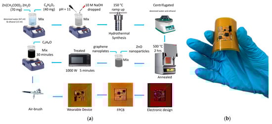 (a) Schematic description of the synthesis of zinc oxide nanoflowers and nanopillars, preparation of graphene ZnO composite, electronics design/assembling process, and air-brush process. (b) Picture of the wearable NFC tag system.