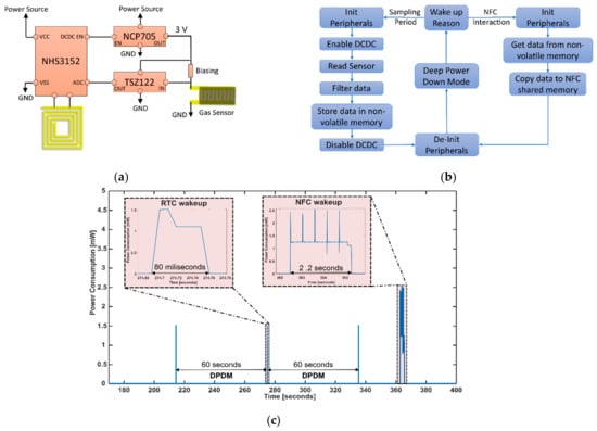 Figure 2a presents the schematic design of the board. The SoC NHS3152 from NXP Semiconductor runs custom-made software that controls the rest of the electronics. Once the board is powered on, the NHS makes sure that the DC-DC converter, NCP705, is turned off and goes to the Deep Power Down Mode (DPDM). This action ensures that all the hardware is off, except for the Power Management Unit (PMU) and the RTC. Also, all digital functional pins are tri-stated except for the reset pin. Before entering this mode, the wake-up sources of the SoC need to be correctly configured. In this design, there are two possible ways; Figure 2b shows the details. The first one is related to acquiring the data from the sensor. Using the RTC, a scheduled wake-up task is performed every 60 s. The SoC is woken up, initializes the necessary peripherals, and enables the DC-DC converter to power the analog channel. The channel is based on an operational amplifier, TSZ122, in a voltage follower configuration to avoid the current leak of the sensor when biased. In this manner, placing the rightful value of the bias resistance ensured a voltage variation that covered the full range of the ADC (0 V–1.6 V). Afterward, an analog-to-digital conversion is conducted, a conditioning of the signal is performed using a windowed filter, and the data is stored inside a non-volatile memory, EEPROM. Then, after de-initializing all the peripherals and disabling the DC-DC converter, the system goes to DPDM again. This procedure takes less than 80 ms, and the peak power consumption during the acquisition is about 1.5 mW, as shown in Figure 2c. It is important to notice that this fast reading-sensor procedure can be achieved because the sensor does not need a warm-up time to be read. The second way to wake up the board is related to NFC field detection. This event occurs every time an NFC reader reads the data. Subsequently, right after the initialization of the peripherals, the data is read from the EEPROM memory and retained in the NFC shared memory to be sent to the NFC reader. This time, the rest of the electronics are kept in off mode, so the average power consumption is lower (1.25 mW) than the wake-up process explained before but takes around 2 s. Finally, when the reader is not nearby, the board goes to DPDM again, and then the power consumption of the whole hardware is the lowest, around 3 µW. The power consumption test was performed using the Keysight B2902A Precision Source/Measure Unit (Figure S1 in the Supplementary Materials shows the details). The wearable NFC tag system shows an average power consumption of 24.9 µW, which is suitable to be used with low-capacity coin cell batteries and, therefore, low weight. (Ex: using a battery CR2032 (Capacity: 210 mAh), the system would theoretically work for more than one year and weigh less than 5 g).