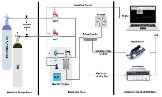 The gas-sensing characteristics of the materials were determined using the system illustrated in Figure 3. The gas measurement system consists of different gas bottles with calibrated gas concentrations balanced in dry air, a carrier gas with zero-grade dry air, and an airtight Teflon® chamber with an inner volume of 25.85 cm3. The gases were delivered into the chamber through a computer-controlled mass-flow system to ensure the reproducibility of the concentrations and a constant low flow of 100 mL/min. The mass-flows are controlled by software named Flow Plot v3.34, running on a Windows-based computer. To fix the sensors inside the chamber, the electrodes were separated from the rest of the electronics using a cutter. Afterwards, the three different materials were air-brushed as explained in Section 2.1 and carefully soldered using an SMD4300AX10 solder paste to a support that fits into the chamber connector. In that manner, the three gas sensors (one of each material: NP, NF, and BG) were put inside the chamber and left under dry synthetic air for a long period to have a stable baseline resistance. Pulses of NO2 gas were injected into the chamber with different concentrations ranging from 50 ppb to 1 ppm, as follows: 50 ppb, 250 ppb, 500 ppb, 750 ppb, and 1 ppm; dry air was supplied in between the gas pulses to recover the baseline and keep the constant flow. All the measurements were performed at room temperature, and the gas exposure time was 35 min and the recovery dry airtime was 70 min for each pulse. This cycle of pulses was repeated 4 times, with 2 h of recovery time between cycles. The sensor resistance was measured and stored employing an Agilent 34972A multimeter (Keysight, Santa Rosa, CA, USA) and software from Agilent Technologies Bench Link Datalogger 3 running on the same computer mentioned before.