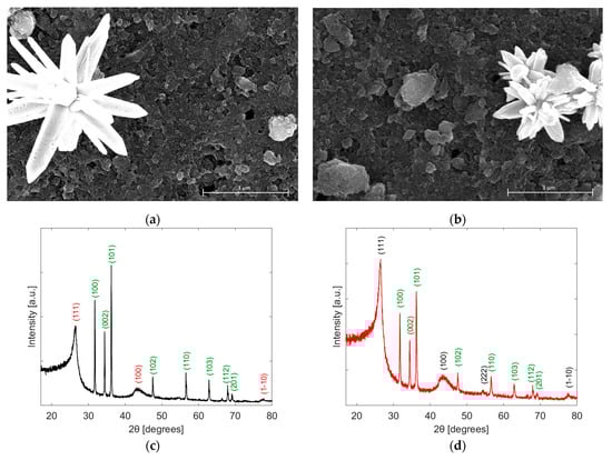 Figure 4a,b present the obtained FESEM images of NP and NF, respectively. A secondary electron detector was used to obtain images on a grayscale, with the nanoparticles as bright materials and a dark background representing the graphene layer. The images were taken on a 3 µm scale. Figure 4a shows the nanopillar structure of the ZnO with some porous formation (small dots) on the surface of the nanopillars, which increases the sensing performance of the active layer. These defects are incorporated into the material by microwave treatment. Figure 4b shows the morphology of the ZnO in a nanoflower shape, in the middle of the graphene layers. The FESEM image of BG is presented in Figure S2 in the Supplementary Materials.