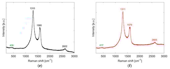Figure 4e,f show the Raman spectra of the NP and NF samples, respectively. D-band is located at 1310 and 1311 cm−1 in each case, which indicates the presence of defects in the graphene lattice. The G-band located at 1580 and 1579 cm−1 reveals the stretching of C-C bonds in both sensors. Moreover, the 2D-band is located at 2622 and 2605 cm−1, and its intensity could be an indicator of the number of graphene layers and is lower than the previous bands. Also, it is observed in both sensors a small peak at 435 and 417 cm−1, which can be attributed to the presence of ZnO in the active layer, normally at 430 cm−1. The Raman spectrum of BG is shown in Figure S6 in the Supplementary Materials.