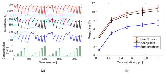 The p–n junction enhances the sensor sensitivity by expanding the depletion region when the film interacts with NO2 molecules. NP and NF exhibit higher sensing performance than BG. Likewise, NF has a better response to NO2 than NP, possibly because its contact area with the target gas is larger than that of NP. Finally, the presence of humidity enhances the sensitivity of graphene-based sensors. At room temperature, water molecules act as a mediated adsorption site for NO2, and additional electrons are released in the conduction band of the metal oxide material, leading to an increased response to the target gas [].