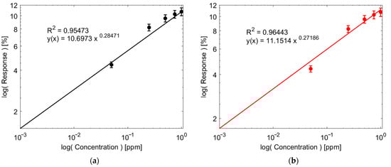 An extended comparison was performed between NP and NF. Figure 6a,b show the fitted calibration curves in log scale using a power-law model for both sensors, which have an R2 of 0.95 and 0.96 for NP and NF, respectively. As a result, the sensitivities of the two sensors at 1 ppm are equal to 3% ppm−1. Likewise, the theoretical Limit of Detection (LoD) was calculated using Equation (2).