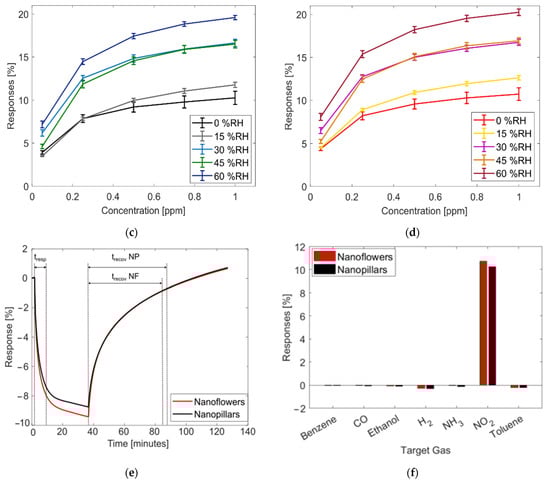 Furthermore, the response and recovery times of the sensors were evaluated in dry air conditions. Under 1 ppm of NO2 exposure, the sensors have a response/recovery time of around 10/47 and 10/49 min for NF and NP, respectively. Figure 6e shows the details of the comparison, and the response time is defined as the time taken to reach 90% of the full response after the introduction of the target gas. The recovery time is defined as the time taken to return to 90% of the baseline resistance after the flow of the target gas is stopped. They were calculated following Equations (3) and (4).