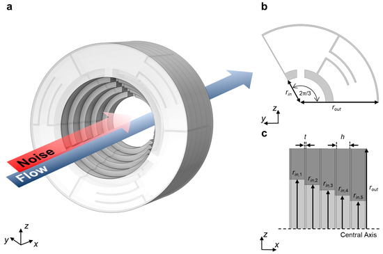 The designed structure comprises a stack of five layers, whose inner radii are narrow over the +x direction, as depicted in Figure 1c. Each layer accommodates the three DHRs in a radial sequence. With these configurations, we promote an increase in the absorption coefficient due to two aspects. One is the asymmetric shape that defines the scattering coefficient dissimilarly based on the incident propagate direction. This definition divides the reflection coefficient by the incident direction, which contributes to controlling the absorption coefficient in a more unconstrained way. The other is critical damping in a DHR or a specific layer. This concept happens when the following layer functions as an effective rigid wall, which reflects the incident energy. This backward energy would be efficiently dissipated if the front layer could resonate with the reflected wave [40].