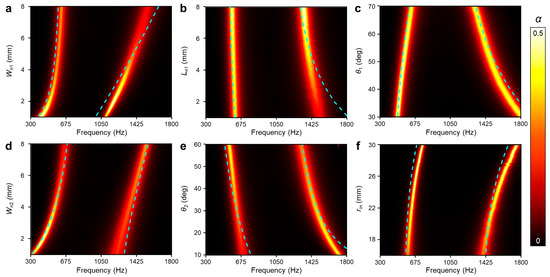 The absorption coefficient (α) by the varying geometric parameters. The dashed line for the analytical resonance frequency. (a,b) Parameters related to the neck of SHR 1: width Wn1 and length Ln1, respectively. (c) Circular sector angle of the first cavity θ1. (d,e) Parameters related to the neck of SHR 2: width Wn2 and length factor θ2, respectively. (f) Open region radius rin.