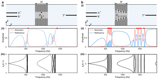 The soundproofing performance of two different waveguide structures. (a) Symmetric central passage with constant inlet diameter. (b) Asymmetric central passage with decreasing inlet diameter along the +x direction. In each section, (i) depicts the layer arrangement and wave propagation along the x direction, and (ii) presents the absorption coefficient (red line) and reflectance (blue line). The red dots display the analytical resonance frequency of DHRs, which are mounted in layers. Additionally, (iii) plots the corresponding band diagram of unit structure with total height H (H = 5h + 6t).