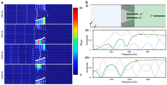 Acoustical response of the simulated structure. (a) Axial plane view of the sound field at certain frequencies. Intensity streamlines and pRMS distribution fields are depicted. (b) (i) Modifications in the analysis domain (green region), where the incident wave starts at the boundary of Din,2 and Din,3 layers. Calculated reflectance (green line) is suggested with the (ii) first and (iii) second absorptive domain of full-waveguide simulation. The red and blue dashed lines correspond to the absorption coefficient and reflectance of full-waveguide simulation, respectively. The red dot indicates the reflectance of modified simulation at the specific frequency, where the third absorption peak was observed in the full-waveguide simulation.