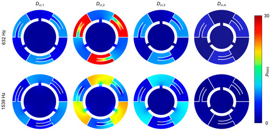 Figure 6 depicts the mid-plane of each layer at the previously studied frequencies: 632 Hz and 1539 Hz. The color map illustrates the RMS value of acoustic pressure, so the part of SHR 2 responds to the lower resonance, and the part of SHR 1 responds to the higher resonance. As these frequencies are above the resonance frequency of the Din,3 layer, feeble resonances are presented as light blue color. From the strong reflection, which occurs between the Din,2 and Din,3 layer, the Din,4 layer with deep blue does not display any reactions. In the opposite direction, intensive resonances are presented in the Din,2 layer, which yields the peak of the absorption coefficient. These localized representations explain the principle of critical coupling and match well with Figure 5a.
