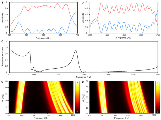 The narrow spacing between each low-frequency absorption peak results in an ambiguous but gentle absorptive band from 550 Hz to 707 Hz, as seen in Figure 7a. The evenly spaced twelve high-frequency absorption peaks create the second absorptive band from 1344 Hz to 1688 Hz in Figure 7b. After these two absorptive regions, the reflective region follows behind the Fano-like interferences. Their collaboration results in over 90% attenuation of the incident sound energy across 550 Hz to 874 Hz and the other from 1344 Hz to 2500 Hz, as shown in Figure 7c.