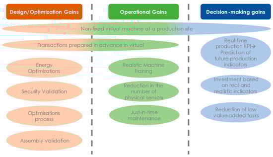 A maintenance operation on a sensor can be recommended by a DTw department, and technicians can prepare it via the planning and visualization service. The gains in this example are multiple: the sensor is only changed when it starts to malfunction; and accessibility operations and tools will have been planned before the intervention, which optimizes the efficiency of human operations and reduces machine productivity losses. The DTw can also be used to predict the future behavior of the system by simulating the future behavior of the system based on the real situation, to test parameter optimizations by simulation, to validate them, and to provide feedback on the control accordingly. The gains are not only at the operational level but also at the decision-making level, facilitating the analysis of performance, quality, and energy consumption. Indeed, a production line DTw can be accessed from a machine as well as from a centralized service. Thus, the decisions are made based on data based on reality and not only on theoretical projections (Figure 2). To be able to obtain its possibilities from DTw, simulation and IoT technologies will be part of a large part of DTws.