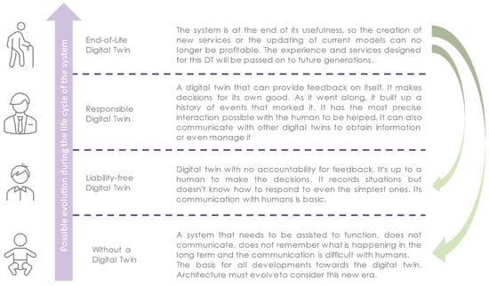 Private and public research laboratories are designing and implementing proofs of concept and frameworks on this technology. The reality on the ground can hinder the relevance of these tools []. However, the maturation of the DTw evolves as it encounters this technology. The constraints of the application domains will be incorporated to create an implementable DTw. The DTw is composed of mechanical and control architectures. It is difficult to modify this architecture in production during the life cycle of the production line. DTw grows over time, as do the different services that aggregate with projects. It increases these capabilities more and more iteratively. Thus, the gains of the DTw are reduced by the project risks []. It also learns, during its life cycle, about different models of settings, normal behavior, failures, etc. They can be used to monitor the system more accurately. DTws can be enhanced by their ability to communicate with other DTws to obtain information. These capabilities could even be from a management perspective with higher-level services. At the end of the system’s existence, the DTw is also at the end of its life. The experience gained with the creation of this DTw, as well as the limitations encountered, must be considered for the design of the next DTw generation. It can also be used to store the real system for the future. Figure 3 summarizes how a DTw can evolve during its life cycle. However, the DTw can reach the conclusion of its life without having passed the various levels of maturity. Nevertheless, experience must be retained to improve future versions of the system. The real and virtual parts of the DTw are not as independent as the DTw suggests. They complement each other to form an integrated system with more control over themself as well as more communication capabilities.