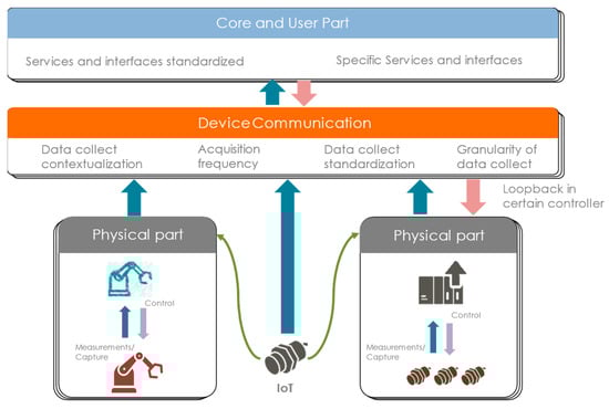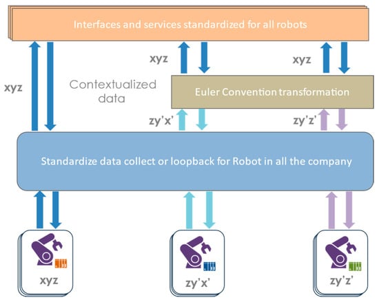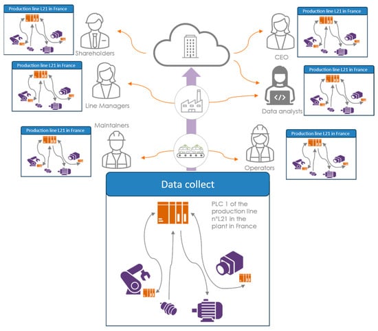The value collected from the real world does not yet have a meaning associated with it. It is this meaning that makes it contextualized. All the metadata around the data then allow this to be understood by those who consume them. This contextualization can take the form of units of measurement (kg, m, s, ms−1, W, etc.), a hierarchy of components (the sensor X belonging to robot X in line X of factory X, etc.), type of process, etc. From the perspective of open data architecture in the company and interoperability, this contextualization is essential to maintaining consistency and understanding between the various trades. Thus, the data are aggregated as they move through the levels of the company with the richness of their metadata so that they can be used in the best possible manner []. Figure 4 illustrates the potential impact of contextualizing data from the moment they are collected for all the company’s stakeholders, even beyond their use in a DTw. This is because each core business receives a virtual representation of the system perception and not a raw list of measurements. The contextualization of the data brings the system closer to each person who needs to analyze them. These metadata, beyond being utilized for human understanding and data analysis, are also a source of information for algorithms and models. It is possible to find the same and consistent data across multiple production sites, giving us a bigger data set. The deployment of services can also be increased by contextualization metadata by self-configuring with the necessary data.