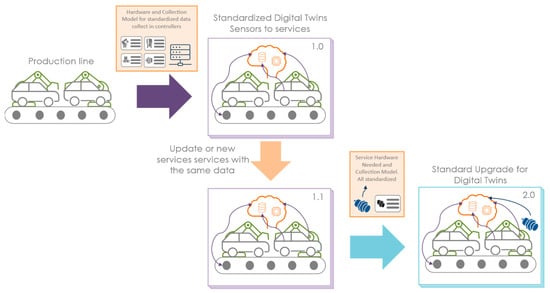 The manufacturing industry is rapidly transforming into a new era, Industry 4.0. Data and their analyses are the main components of this industrial revolution that we are experiencing. Artificial intelligence, connectivity, Digital Twin (DTw), and intelligent inter-issues obtain data from the real world. DTw is a technology based on this connectivity between the real and virtual worlds [,] whereby the virtual is a vision of its real part to increase its capabilities. Different devices have different data refresh rates, power, and communication protocols. This diversity in the world of Operational Technology (OT) makes it complex. Feeding a DTw with data from the physical world is a real challenge requiring expertise from OT to Information Technology (IT) []. This challenge is very difficult when the system already exists. Deploying a DTw therefore has a significant cost to design and deploy it, and also to maintain it []. This is because collection, models, and analytics must be constantly updated with real-world developments. Duplicating a DTw facilitates the return on investment and the development of this technology, which is expensive to implement []. Data collection is the pivot between the two worlds. The available data must allow the creation of standard services and, conversely, the lack of data must allow the standardization of their measurement and collection []. The difficulty of large-scale deployment of standardized data collection in the manufacturing sector is slowing down the deployment of a first generation of DTws in existing systems. The objective of this article is to propose a framework for the development and large-scale deployment of an evolutive DTw in the manufacturing domain.