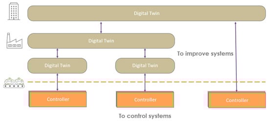 Data collection needs to evolve over time and different projects around the production line. Modular data collection is therefore preferable. However, the modularity of the collection should not be achieved by diversifying it. Considering the versioning of data collection models is the first solution to this modularity. It allows you to update the data collected not only for your new needs but also for your interfaces and all the associated services. In this way, the associated services can be versioned and tested globally before deployment on premises. This modularity of the collection deployment can be compromised if part of the control is carried out by the collection system. This is why the DTw seems to be, in principle, not essential for control. It optimizes the system, makes it more resilient, and makes it easier to understand while remaining independent (Figure 7). Thus, it can be scaled with more flexibility than controllers. However, this flexibility is limited by the architecture and interfaces of the controllers to obtain the optimizations from the DTw.