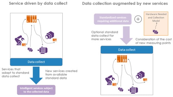 Another way to evolve DTw is through the integration of new sensors to achieve new services. In this integrated approach from the sensor to the DTw, the service can be created by the sensors available through the collection of standardized and contextualized data, but the reverse is also possible. This is because a service may require the addition of standard sensors to the system. Thus, to implement this standard service, the additional sensors to be installed, as well as the collection model, are standardized. Thus, the standardization of a system does not end with the addition of additional sensors. On the contrary, it allows for a more in-depth study of the observability needs and the appropriate sensors to obtain the best result. The standardization of data collection can therefore be considered in the form of options to be able to integrate new services as needed. Additionally, smart services will be integrated directly if they are designed for the contextualized information of the new sensors. We see data collection as the pivot between the real and virtual worlds, requiring a two-way connection for connection but also for the integration of services and sensors into its architecture (Figure 9). The service has all the necessary data to work with the system’s basic data collection, or it will be necessary to add new measurement points. The hardware and the integration method are then standardized. Thus, the need is driven by data collection, and services are driven by available data. The material cost and the cost of implementing new measurement points must be able to measure the relevance of the implementation or its duplication.