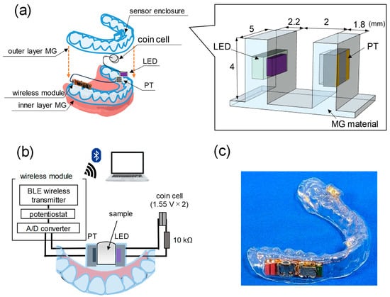 Figure 1a shows the configuration of the MG-type salivary turbidity sensor developed in this study. This sensor consists of a phototransistor (PT, APS3227SP1C-P22, Kingbright Electronic Co, Ltd., Taiwan, 3.2 mm × 2.7 mm × 1.1 mm, peak sensitive wavelength 580 nm), LED (SM1206UV-405-IL, Bivar Inc., Irvine, CA, USA, 3.2 mm × 1.4 mm × 1.6 mm), wireless module (customized, Discretek Inc., Shizuoka, Japan, 28 mm × 8.5 mm × 3.7 mm), and coin cells (SR716SW, Panasonic Corporation, Osaka, Japan) sealed inside a double-layered MG. The PT and LED were installed facing each other on the lingual surface of the incisor. This sensor evaluated the salivary turbidity by measuring the transmittance of light emitted from the LED through the saliva flowing in the gap between the LED and PT.