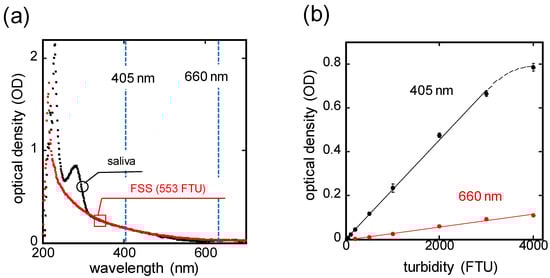 (a) OD spectrum of a saliva sample and FSS prepared to 553 FTU; (b) turbidity-dependent characteristics of OD for wavelengths of 405 and 660 nm on FSS.