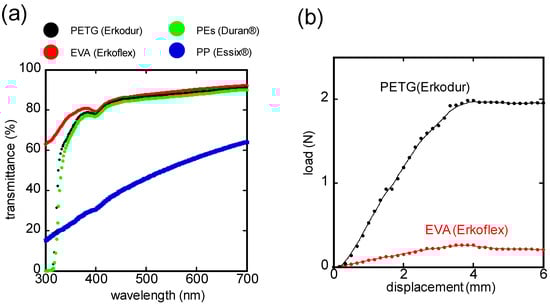 (a) Transmittance spectrum of some commercial MG materials; (b) mechanical characteristics of MG materials (PETG and EVA) obtained from three-point bending test.