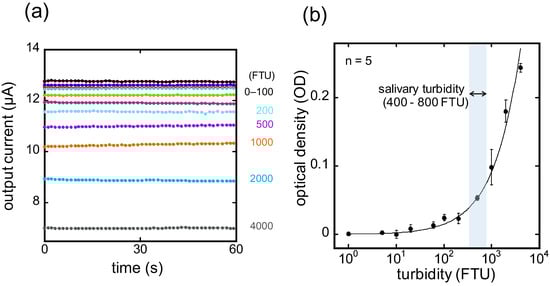As an evaluation index of oral hygiene, quantification of oral bacteria is widely used []. A typical method for quantification of oral bacteria is to culture sampled dental plaque [] or tongue plaque []. However, the culturing process requires time and appropriate equipment, and is not suitable for real-time evaluation of oral hygiene. As a simpler sample for oral hygiene evaluation, mouth-rinsed water has been utilized [,]. Takeuchi et al. reported that the turbidity of mouth-rinsed water is a potential indicator of several oral health conditions, including oral hygiene []. On the other hand, sampling of mouth-rinsed water requires the external water supply and rinsing process, making it difficult to realize a continuous oral hygiene evaluation system utilizing mouth-rinsed water closed in the oral cavity. As with mouth-rinsed water, saliva is a notable oral biomarker that has various health-related information []. Saliva also contains bacteria by retention in the oral cavity. This bacteria contamination mechanism is similar to that of mouth-rinsed water, and the high correlation between the bacteria in saliva and those in mouth-rinsed water [] indicates that salivary turbidity can be a promising indicator of oral hygiene. Because saliva is naturally produced in daily life without any external operations, a closed measurement system, such as an intra-oral wearable sensor [], can be realized in the oral cavity.