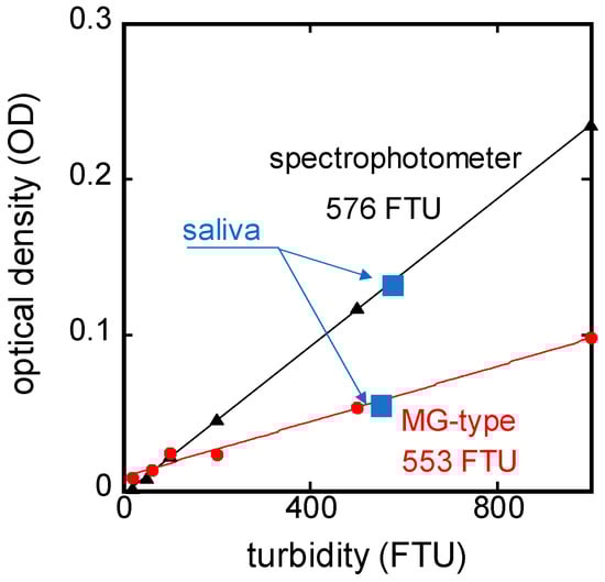 The turbidity measurement result when the saliva sample collected from a subject was dropped and held in the turbidity-sensing part of the MG-type sensor was 553 FTU, as shown in Figure 5. Also, substituting the OD value of the same saliva sample measured with the microvolume spectrophotometer into the following equation derived from the results indicated by the black line in Figure 2b, the turbidity of the saliva sample was calculated to be 576 FTU: