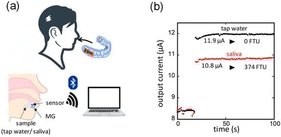 (a) Schematics of in vivo experiment of wireless turbidity measurement; (b) output current of MG-type sensor for tap water and saliva in the oral cavity.