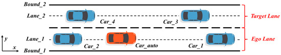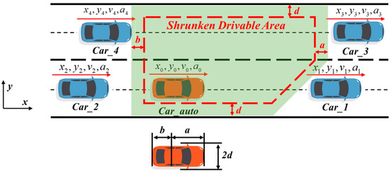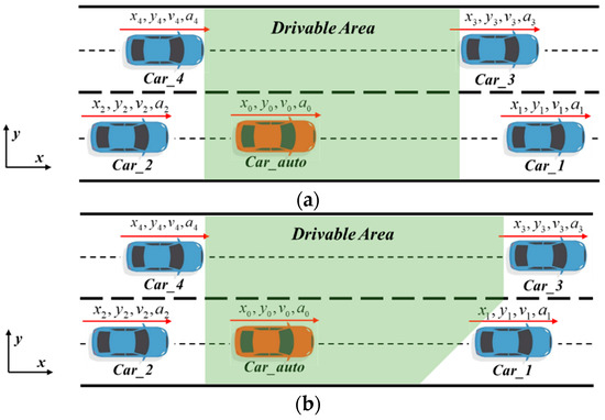 - A method for dynamically constructing convex polygon drivable areas is proposed based on the information of the ego vehicle and surrounding vehicles’ positions, velocities, and accelerations. This provides collision-free optimization space for subsequent trajectory planning, improving planning efficiency.