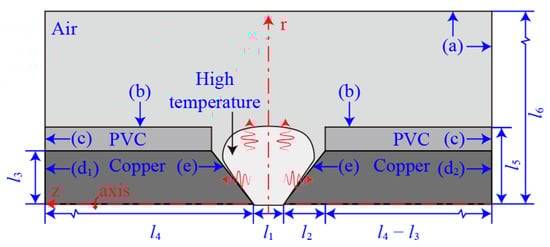 A 2D axisymmetric geometric model is established to study the AC arc generated by the short gap of copper-core cables, as shown in Figure 1. The geometric model includes air domain, copper wire, and PVC cable sheath. The end of the copper electrode is a conical tip, and the geometric model is connected to the 220 V/50 Hz AC source and a pure resistor in series between boundaries d1 and d2. The electrode gap l1 is 0.25 mm, the length of the electrode tip l2 is 1 mm, the radius of the copper electrode l3 is 1.38 mm, the length of single electrode l4 is 10 mm, the radius of the cable l5 is 2 mm, and the width of the whole geometric model l6 is 10 mm. An AC arc is generated between the electrode gaps, and the high temperature generated by the arc transfers heat to the surroundings.