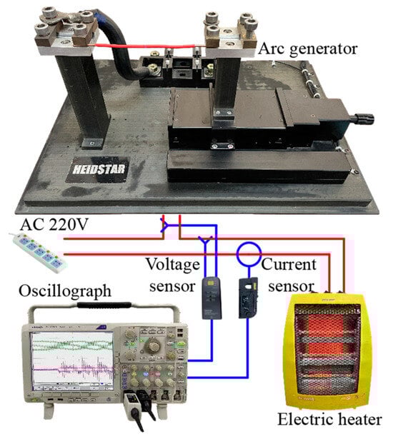An AC arc experimental platform was built for the studies presented in this paper, as shown in Figure 2. The controllable electrode gap in the arc generator is from Heidstar Technology (Xiamen, China) Co., LTD. The Keysight N2790A high-voltage differential probe and Keysight N2781B hall current sensor collect the AC arc voltage and current, respectively. The Tektronix DPO 4104B-L (Tektronix, Beaverton, OR, USA) digital phosphor oscilloscope stores and displays AC arc voltage and current. The heater is a pure resistive load, which can adjust the gear to produce an AC arc with a peak current of about 2 A/4 A/6 A.