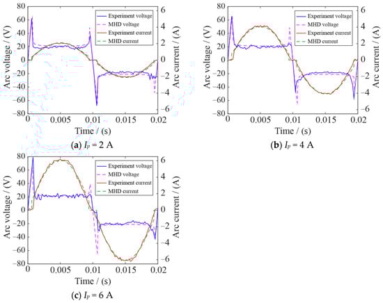 Figure 3 shows the arc voltage and current changes in the two adjacent AC half-waves obtained by the MHD model and the AC arc experiment. When entering an AC half-wave and at the end of an AC half-wave, the electrode gap is not broken down and is in the ‘zero current’ stage, the AC arc voltage is AC 220 V/50 Hz, and the AC arc current is 0. The arc voltage remains approximately unchanged after entering the stable burning stage of the AC arc. The arc voltage consists of anode voltage, arc column voltage, and cathode voltage. Because the AC arc studied in this paper belongs to a short arc, the arc column is short, so the arc column pressure drop is negligible. The anode voltage drop and cathode voltage drop are related to the electrode material and remain unchanged, so the AC arc voltage remains approximately unchanged during the burning stage [,,]. In the AC arc burning stage, the arc current is approximately sinusoidal, and the amplitude is 2 A/4 A/6 A. Since the arc has a nonlinear pure resistance, the thermal power and electrical power of the arc are consistent [,]. Figure 3 shows that the changes in AC arc voltage and current obtained by the MHD model and AC arc experiment are relatively close, so the MHD model’s heat generation and temperature field distribution are considered to be accurate.