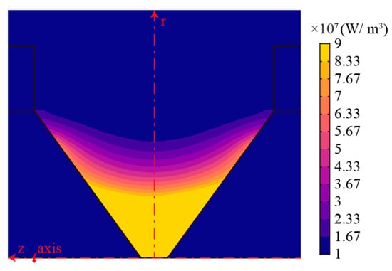 Heat source distribution between the electrode gaps when Ip = 2 A, t = 0.001 s. (For easy display, the heat source range is selected from 1 × 107 to 9 × 107 W/m3, and the remaining range fluctuates wildly).