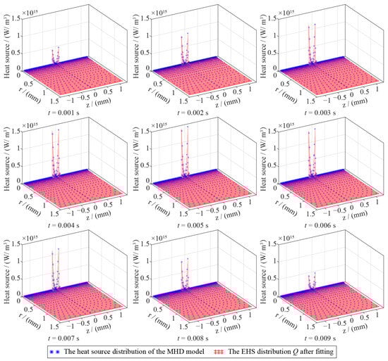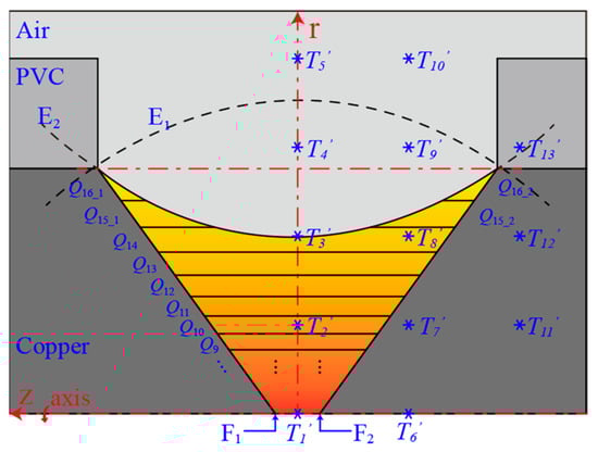 In order to further simplify the model and reduce the number of calculations, Q(r, z, t) is divided into 16 independent EHS in the r direction, and the r of each independent EHS is set to a fixed value. The dividing limits of the 16 independent EHSs are r = 0, 0.01, 0.03, 0.06, 0.1, 0.15, 0.21, 0.28, 0.36, 0.45, 0.55, 0.66, 0.78, 0.91, 1.05, 1.20, 1.38 mm, respectively. The intermediate value of the two adjacent partition boundaries is taken as the r of the independent heat source, so the values of r1, r2, …, r16 for the 16 EHSs are 0.005, 0.02, 0.045, 0.08, 0.125, 0.18, 0.245, 0.32, 0.405, 0.5, 0.605, 0.72, 0.845, 0.98, 1.125, 1.29 mm, respectively. Therefore, Q(r, z, t) is divided into Q1(r1, z, t), Q2(r2, z, t), …, Q16(r16, z, t), which are substituted as Qarc into Equation (10), and the temperature distribution can be obtained. The EHS Q of the AC arc is divided into multiple independent EHSs.