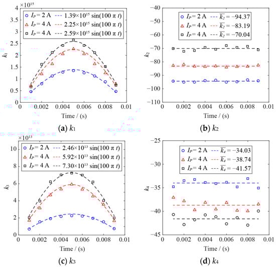 A case of comparing the AC arc EHS function after fitting Equation (12) with the heat source distribution obtained by the MHD model (Ip = 2 A) is shown in Figure 5. The difference between the fitted EHS function Q and the heat source obtained by the MHD model is slight. The coefficients k1, k2, k3, and k4 are obtained by Equation (12) in different AC arc peak currents and time, as shown in Figure 6. When the arc current is determined, k1 and k3 increase first and then decrease in an AC half-wave, consistent with the change in the sine function. Therefore, the time-dependent sine function can describe k1 and k3. When the AC arc peak current is determined, k2 and k4 change little with time. Therefore, the values of k2 and k4 are the mean values of k2 and k4. The relationships between k1, k2, k3, k4, and time are obtained, and the AC arc EHS model function Q is constructed.