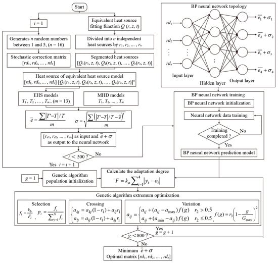 A genetic algorithm optimizes the trained BP neural network. Compared with the traditional optimization algorithm, the genetic algorithm optimization has the advantages of group search, high search efficiency, operation speed block, and good adaptability. Figure 8 shows the process of the genetic algorithm, including population initialization, fitness function, selection operation, crossover operation, and mutation operation [,]. The first step is to initialize the population of the genetic algorithm. The individual coding method is real coding, which consists of four parts: ① the connection weight of the input layer and the hidden layer, ② the hidden layer threshold, ③ the connection weight of the hidden layer and the output layer, ④ the output layer threshold. The second step is to calculate the fitness. The absolute error value between the predicted output yi and the expected output oi is the individual fitness value F, where ka is the coefficient. The third step is the selection operation. This article uses the roulette method since the more negligible the fitness value Fi of the individual i, the better. The fitness value is first inverted, then the probability pi of the individual i selected is calculated. Where kb is the coefficient, and N is the number of individuals in the population. The fourth step is cross-operation. Because the individual adopts real number coding, the cross-operation method adopts a real number crossover method. The kth chromosome ak and the l chromosome al are crossed at the j position. Where r1 is a random number between 0 and 1. The fifth step is mutation operation. The jth gene aij of the ith individual is selected for mutation. Where amax and amin are the upper and lower bounds of the gene aij, respectively, r2 is a random number between 0 and 1, g is the current number of iterations, Gmax is the maximum number of iterations, and r3 is a random number. The sixth step is determining whether the maximum number of iterations is reached, and the optimal individual is output at the maximum number of iterations, creating an optimal AC arc-segmented heat source correction matrix [rd1, rd2, …, rd16], which can obtain the minimum temperature error with the MHD model.