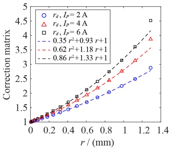 Figure 9 shows the values of each element in the resulting optimal correction matrix and the fit with r. The optimized AC arc-segmented EHS calculates the temperature distribution and compares it with the MHD model. When Ip is 2 A, 4 A, and 6 A, the average temperature error of the temperature measurement point is 5.8%, 4.4%, and 5.2%, respectively, and the overall standard deviation is 0.015, 0.011, and 0.013, respectively. Therefore, the EHS of the AC arc can be used to replace the MHD model in studying the thermal characteristics of the AC arc in the short gap of a copper-core cable.