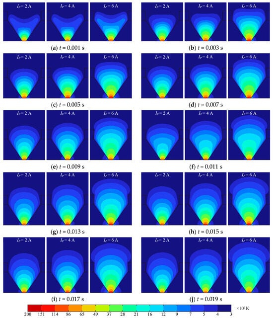 Figure 10 shows the temperature distribution obtained using the segmented EHS of the AC arc when two AC arcs are generated continuously. In an AC half-wave, the high-temperature region exceeding 8000 K before the peak time of 0.005 s gradually increases and decreases after the peak time. However, during the heat generation process of the whole arc, the heat in the high-temperature region is gradually transferred to the surrounding area, and the temperature of the surrounding air and the electrode increases. After that, the second AC half-wave is generated, and the heat is accumulated at the residual temperature at the end of the first alternating current arc, prompting the temperature of the air and electrode to rise in a larger area. In addition, as the arc current increases, the electric power heat production increases, and the temperature will be higher in large arc currents.