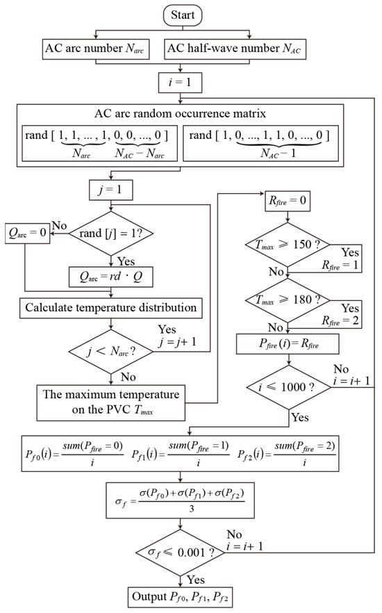 Figure 11 shows the fire risk assessment method and risk probability calculation process of the PVC cable fire caused by the AC arc. Based on the EHS model of an AC arc, this paper calculates the fire risk probability under different numbers of AC arc Narc generated at the random AC half-wave position when the AC half-wave number NAC is 10/20/30/40/50/60/70/80/90/100. The first half-wave of the AC half-wave number NAC produces an arc, and whether the subsequent NAC-1 half-wave produces AC arcs is random. The AC arc number Narc is less than or equal to the AC half-wave number NAC. In the AC half-wave of the AC arc, the Qarc is the EHS of the AC arc. On the contrary, the Qarc is 0. Then, the temperature distribution is calculated by Equation (10).