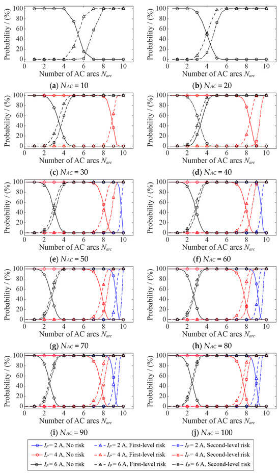 The PVC fire risk level probability of Narc AC arcs randomly generated in NAC AC half-waves. (When IP = 2 A, NAC = 10/20/30/40, and IP = 4 A, NAC = 10/20, there is no fire risk, which is not shown in the figure).