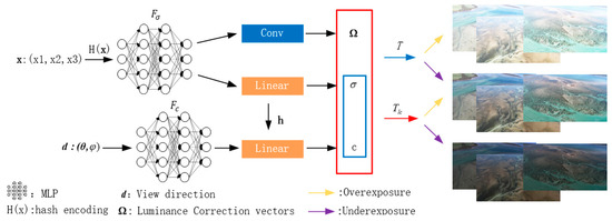 Settings rendered for both sets of images use the same underlying density field along each camera ray r(t). For the collected overexposure tidal flats images, two sets of images are rendered by using and , respectively, according to the yellow arrows in Figure 3. We calculated the loss function between the image rendered by and the overexposed training image in order to get closer to the true value of the normal image rendered using . For the captured underexposed tidal flats images, according to the purple arrows in Figure 3, the loss function between the rendered image and the overexposed training image is computed. So, we can get closer to the real value of the normal image rendered with .
