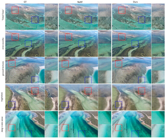 Figure 7 unmistakably illustrates the superior performance of our method within the same tidal flats environment, showcasing more intricate and nuanced results. In the “ground textures” scene group, the traditional NeRF algorithm produces images with inaccuracies along the edges of the tidal flats. This critical error holds significance for both precise rendering and the preservation of tidal flats environments, potentially leading to avoidable complications.