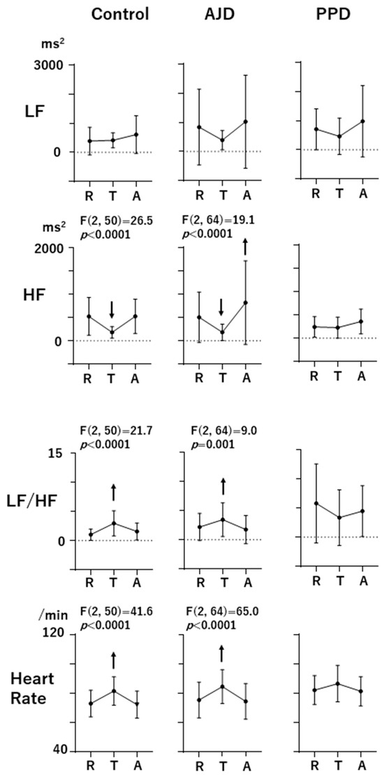 In Figure 1, the profiles of LF, HF, LF/HF, and HR during the three-behavioral-state paradigm (R: Rest, T: Task, and A: After) are shown. The F and p values are shown on the upper part of each profile when the effects of state (Rest, Task, or After) are significant according to the ANOVA results (p < 0.05). The upward and downward arrows indicate the statistical significance of increases and decreases, respectively, from the Rest scores revealed by the post hoc Tukey’s multiple comparison test. HF showed a decrease during the Task state (p < 0.0001) and returned to the Rest level during the After state (p = 0.998) in the control women. In the AJD patients, HF showed a decreasing response during the Task state (p = 0.0008), the same as in the control group, but exceeded the Rest level during the After state (p = 0.0008). On the other hand, HF in the PPD patients showed no response during the Task and After states. The LF/HF scores and HR in the control women and AJD patients showed the same pattern, with an increment during the Task state (LF/HF, p = 0.0001 for the control and p = 0.034 for AJD, respectively; HR, p < 0.0001 for the control and p < 0.0001 for AJD, respectively) and a return to the Rest level during the After state (LF/HF, p = 0.065 for the control and p = 0.331 for AJD, respectively; HR, p = 0.199 for the control and p = 0.352 for AJD, respectively). However, LF/HF and HR in the PPD patients showed no significant changes during the three-behavioral-state paradigm.