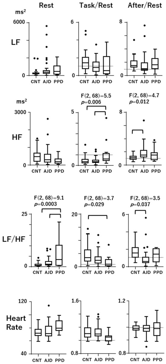 In Figure 2, the Rest scores as well as the Task/Rest and After/Rest scores among the control women, AJD patients, and PPD patients are presented in the box/whisker plots with Tukey’s format. The F and p values at the top indicate that the effects of group (control, PPD, and AJD) were significant according to the ANOVA test (p < 0.05). Line connections between the data indicate the presence of statistical differences revealed by the post hoc test. The Task/Rest ratio of HF in the PPD patients was significantly higher than that in the control women (p = 0.014) and AJD patients (p = 0.006). The decrement in HF during the Task state, which was found in the control women and AJD patients, was attenuated in the PPD patients. In the AJD patients, the After/Rest ratio of HF was significantly higher than that in the control women (p = 0.009), indicating an increment in HF after the task was over, which was not observed in the PPD patients. The LF/HF at Rest was significantly higher in the PPD patients than that in the control women (p = 0.0002) and AJD patients (p = 0.004). The Task/Rest ratio of LF/HF in the PPD patients was lower than the control women (p = 0.034). In the AJD patients, the After/Rest ratio of LF/HF was significantly lower than that in the control women (p = 0.028), and the PPD patients did not exhibit this profile. The Rest scores, as well as the Task/Rest and After/Rest ratios of LF and HR, were not different among the three groups (control, AJD, and PPD).